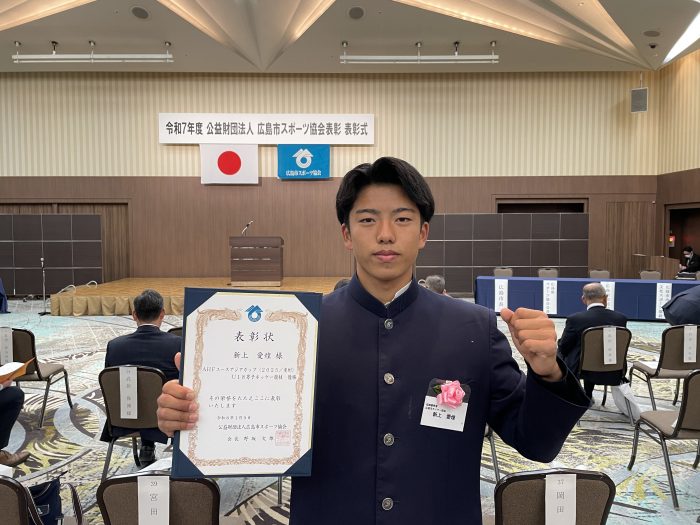2026年1月9日(金)にグランドプリンスホテル広島で開催された令和7年度広島市スポーツ協会表彰の式典にて、国際大会の部の成績優秀者としてホッケー部3年新上愛煌くんが表彰されました。新上くんは2025年U-18日本代表の主力選手としてホッケーアジア大会に出場し、初の優勝を飾る活躍をしました。
