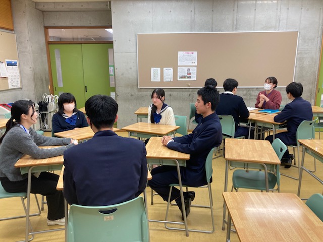 「放課後多機能自習室」の企画として、広島大学の学生による「大学生活座談会」を開催しました。将来の進路をテーマに、生徒と大学生が少人数のグループに分かれて話し合い、勉強の仕方や受験期の乗り越え方、進路選択の考え方などについて具体的なアドバイスをもらいました。また、大学での授業やサークル、一人暮らしの様子など、普段なかなか聞くことのできないリアルな大学生活の話に、生徒たちは熱心に耳を傾けていました。