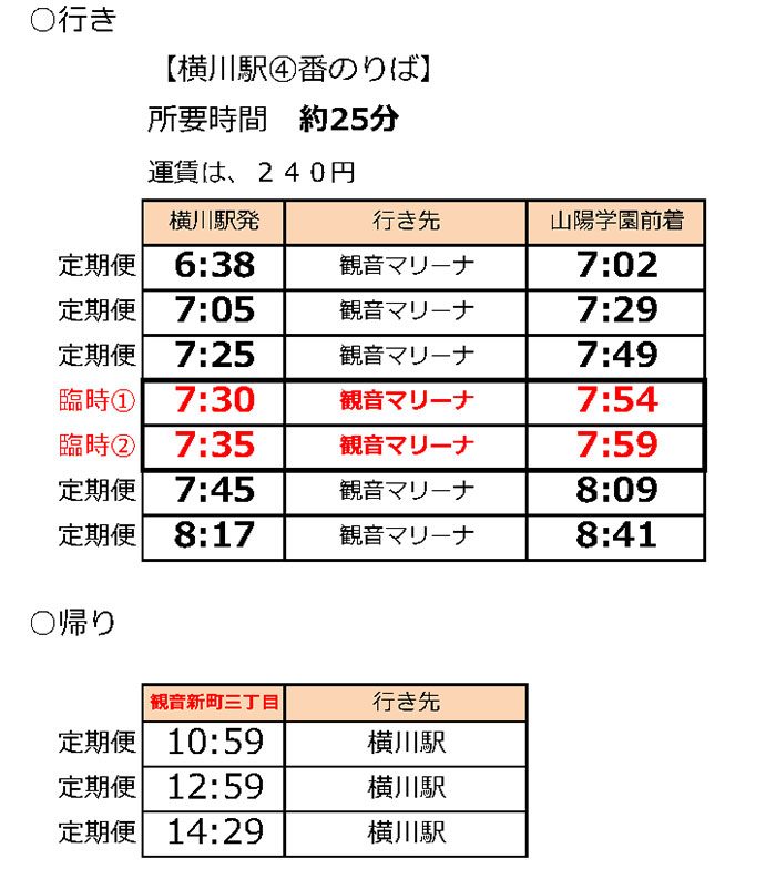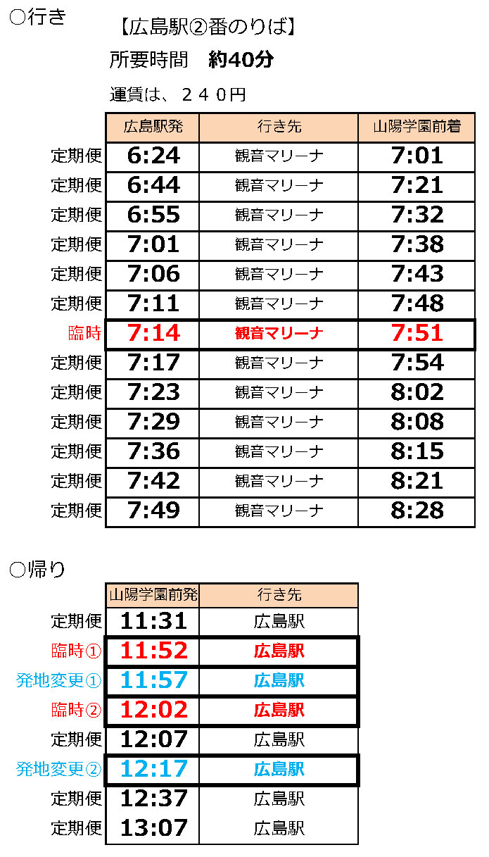 ホームSANYO STYLE 一般入試 広電バス臨時便のお知らせ 2026年2月9日 一般入試実施日の2月12日、広島駅発観音マリーナ行き3号線(2番乗り場)と横川駅発観音マリーナ行き8号線(4番乗り場)に臨時便が運行されます。 広島駅をご利用の方 横川駅をご利用の方 2月12日一般入試 広電バス臨時便のお知らせ(PDF)