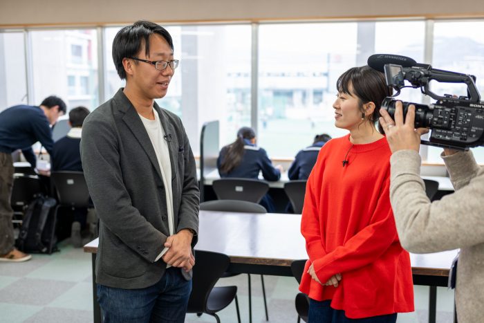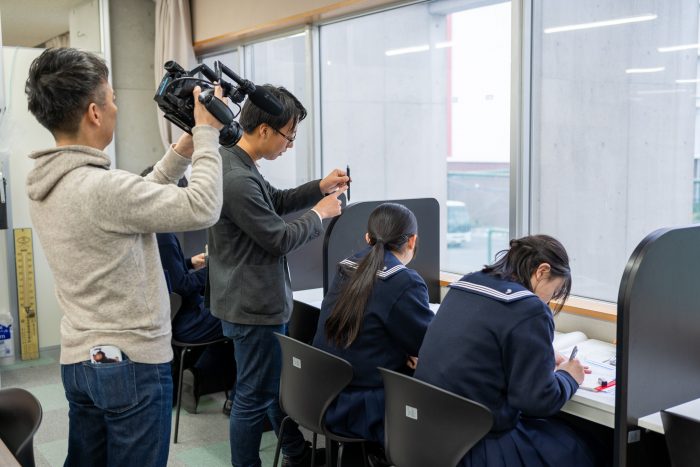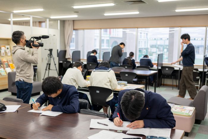 広島大学学生ベンチャー企業株式会社スターベルズと本校がタッグを組み運営している放課後多機能自習室にテレビ取材が入りました。番組は、満点ママ!!(テレビ新広島)です。当日は朝から撮影スタッフの方々が来校され、カメラや音声機材が設置されるなど、いつもとは少し違う雰囲気の中でスタートしました。生徒たちは最初こそ緊張した表情を見せていましたが、学習が始まると自然と集中モードに切り替わり、普段通り真剣に机に向かう姿が見られました。