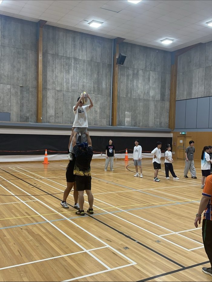 ラグビー体験を行い、ラインアウトでは高く上がるボールに大興奮!