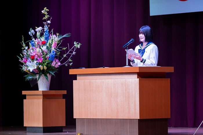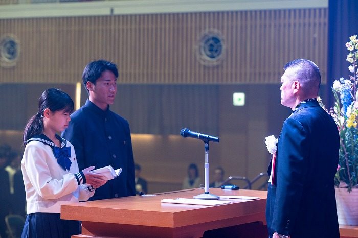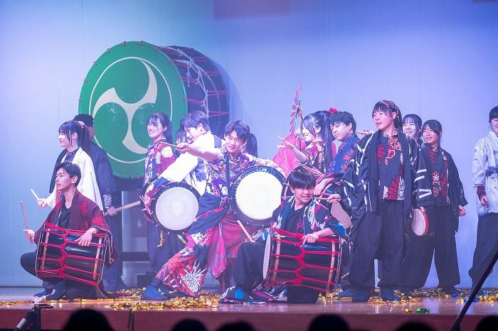 新入生のみなさんは吹奏楽部の盛大な演奏の中、会場へ入場。オープニングとして和太鼓部の勇壮な演奏とともに入学式が始まりました。