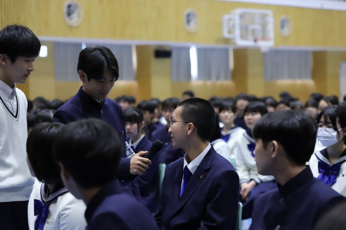 発表の合間には1年生へのインタビューも行われ、 感想や興味を持ったクラブについての声が紹介されるなど、会場全体でクラブ紹介を楽しむ様子が見られました。